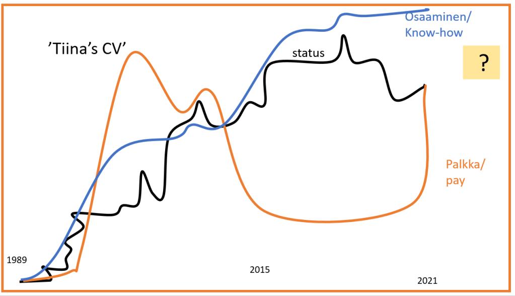 Minua pyydettiin kertomaan työelämäni vaiheista ja urakehityksestä eräässä ryhmässä. Intouduin sitten vapaalla kädellä muotoilemaan oman elämäni CV-käppyrät. Ilman mitään taulukkoa takana, vapailla aikajanoilla, mittasuhteet killissä ja monia faktoja oikaisten, toisia korostaen.